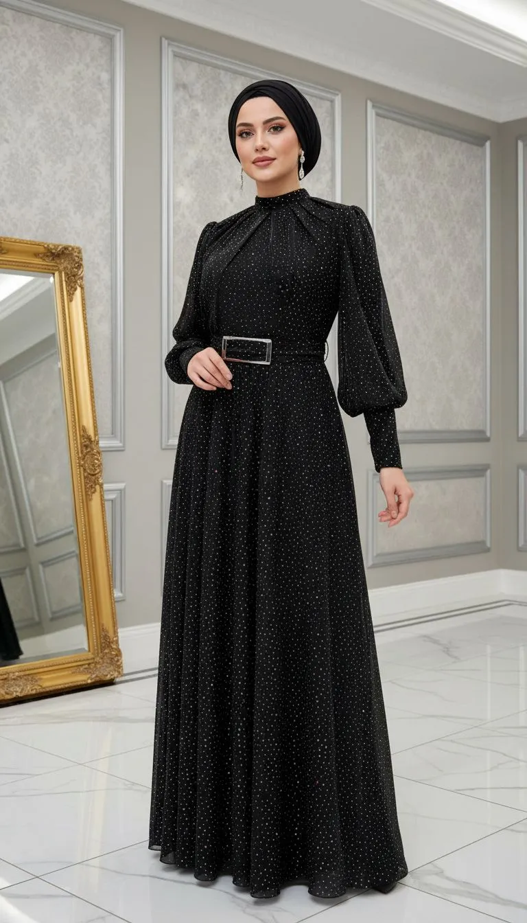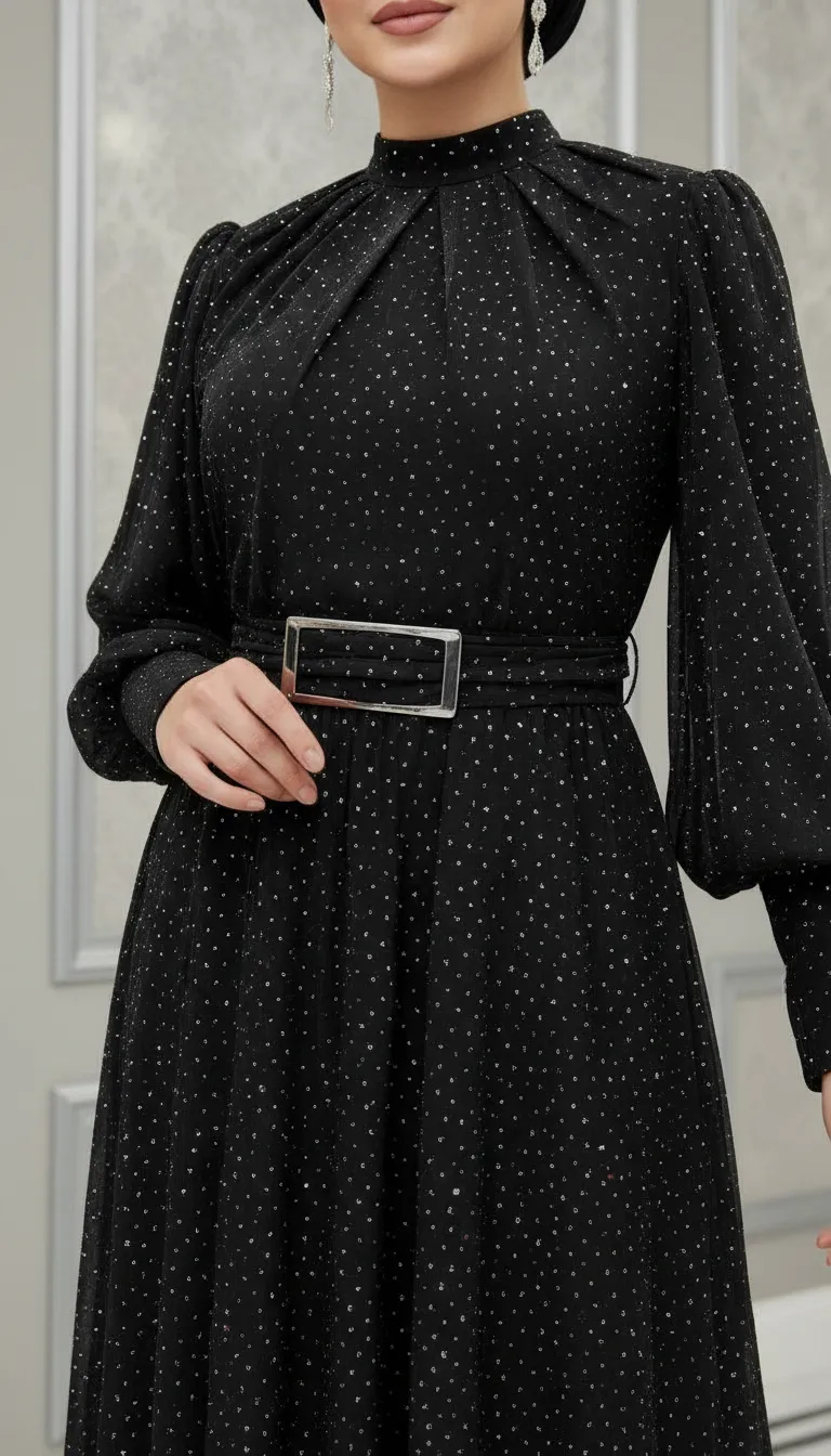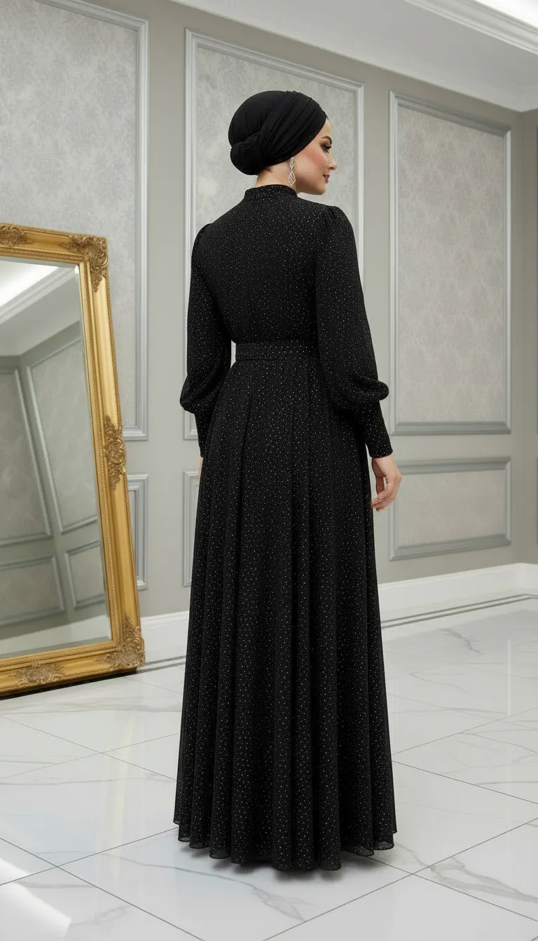 ıklığı ve zarafeti bir arada sunan bu pul detaylı tesettür abiye elbise, özel gün ve davetler için mükemmel bir tercihtir. İnce sim/pul işlemeleriyle hareket kazanan kumaşı, ışıkta hafifçe parlayarak göz alıcı fakat sade bir şıklık sunar.